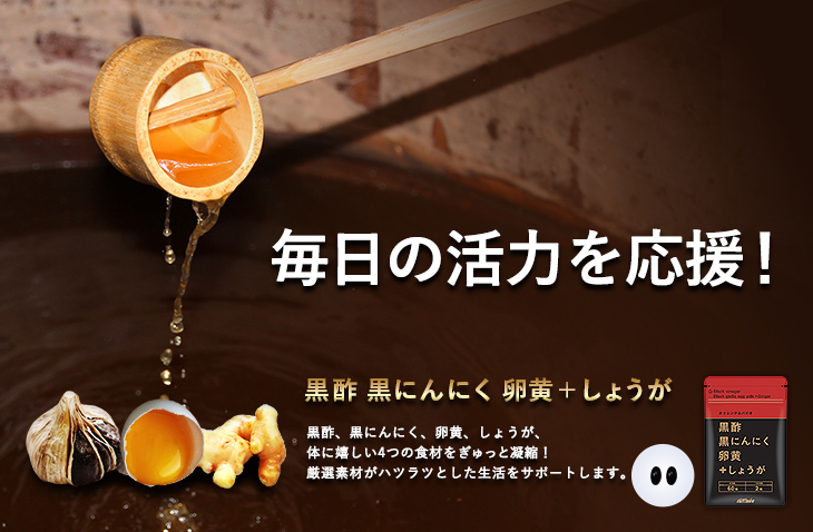 青森県産の福地ホワイトをじっくり発酵・熟成させて得られた黒にんにくと、国内産玄米を100%使用した黒酢に、平飼いの有精卵、さらにホットな成分のしょうがを配合しました。厳選素材がハツラツとした生活をサポートします。