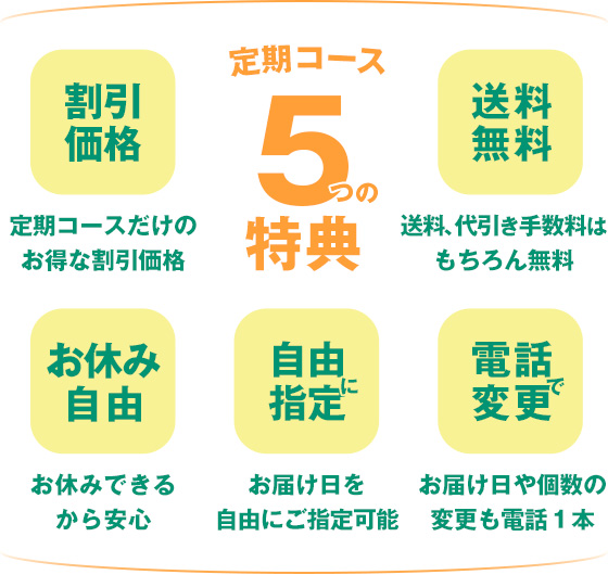 5大特典→割引価格送料無料お休み可能届日自由指定マイページ・お電話1本で変更可能
